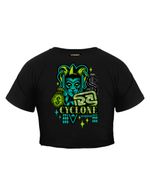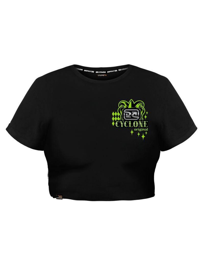 Baby Look Cyclone Cropped Cash Joker Metal em malha penteada com silk metalizado exclusivo.