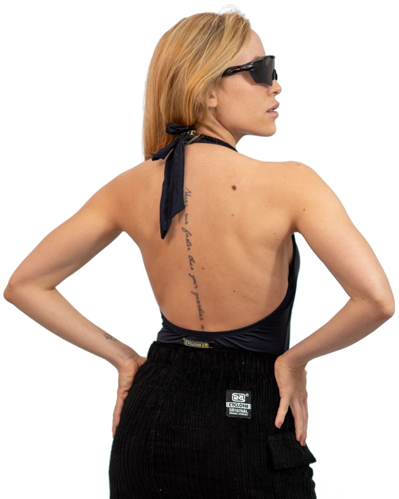 Body Cyclone New Santorine em malha poliamida com silk metalizado exclusivo.
