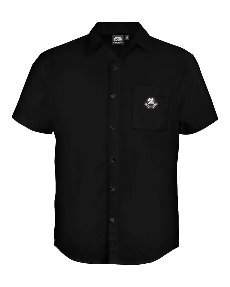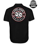 Camisa Cyclone Tecido Circle Waves Metal em tricoline com manga curta, abotoamento frontal e silk metalizado exclusivo. Possui bolso unilateral com patch exclusivo da Cyclone. Composição: 100% algodão (Ref 01040714) (Coleção Verão26)