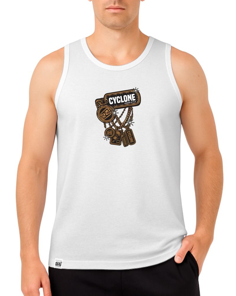 A Regata Cyclone Gold Chains Metal é a escolha perfeita para quem busca conforto e estilo no dia a dia. Confeccionada em meia malha penteada de alta qualidade e com silk metalizado exclusivo, esta regata masculina da Coleção Inverno26 combina com bermuda água e chinelo, garantindo um visual moderno e despojado.